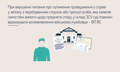 Having examined the case, the Grand Chamber of the Supreme Court noted that a court is obliged to suspend proceedings in a case where a party or a third person asserting independent claims regarding the subject matter of the dispute is serving in the Armed Forces of Ukraine or other military formations established in accordance with the law that have been transferred to martial law status or involved in conducting an anti-terrorist operation (point 2 of part 1 of Article 251 of the Civil Procedure Code of Ukraine).