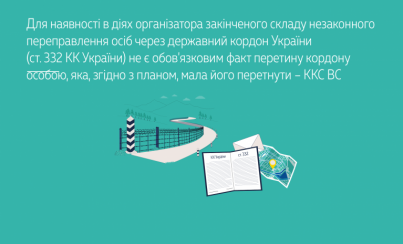 Upholding the decisions of the lower courts, the Supreme Court stated that illegal crossing of persons through the state border of Ukraine consists of actions by a person aimed at ensuring the crossing (transportation or escort) of the state border by other individuals. The organization of such illegal crossing includes actions such as developing plans, determining the place and time of the illegal crossing, recruiting accomplices, forming an organized group, financing or arming it, etc.