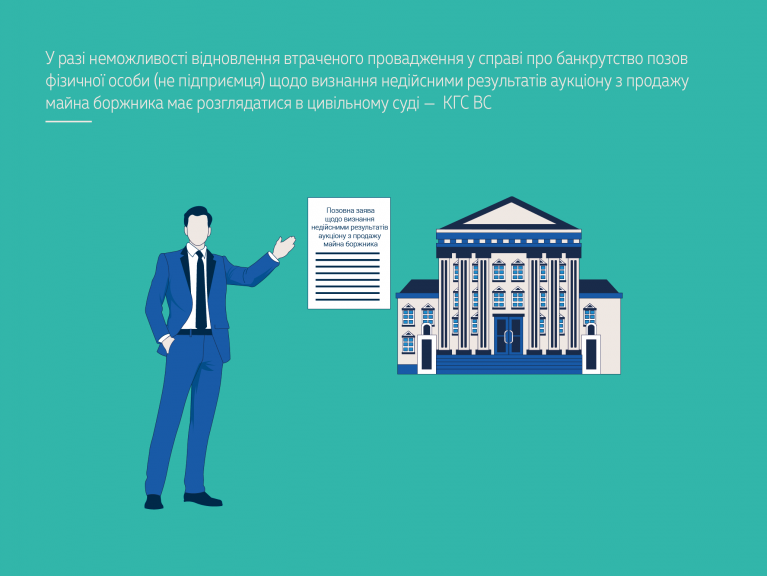 Отже, якщо справа про банкрутство боржника втрачена й не підлягає відновленню, позов фізичної особи (не підприємця) про визнання недійсними результатів аукціону з продажу майна цього боржника та укладеного договору не розглядається в господарському судочинстві, а має бути вирішений у порядку цивільного судочинства (ст. 19 ЦПК України).