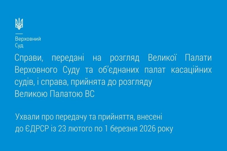 Цього тижня знайомимо вас зі справами, переданими на розгляд Великої Палати Верховного Суду та об’єднаних палат касаційних судів, а також зі справою, прийнятою до розгляду Великою Палатою ВС, відповідно до ухвал про передачу та прийняття, внесених до ЄДРСР із 23 лютого по 1 березня 2026 року.