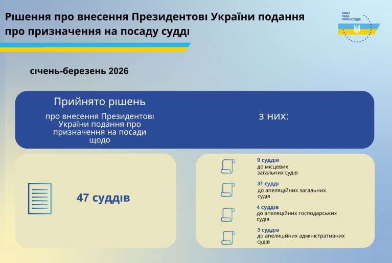Вища рада правосуддя протягом трьох місяців 2026 року ухвалила рішення про внесення Президентові України подання про призначення 47 кандидатів на посади суддів, з них: