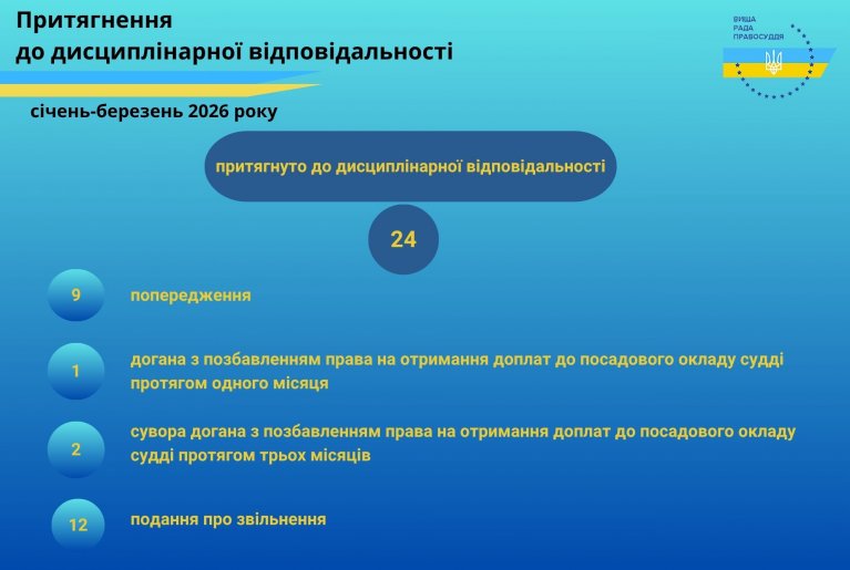 За результатами розгляду дисциплінарних справ упродовж січня – березня 2026 року Дисциплінарні палати Вищої ради правосуддя ухвалили 24 рішення про притягнення до дисциплінарної відповідальності 24 суддів та застосування до них таких видів дисциплінарних стягнень: