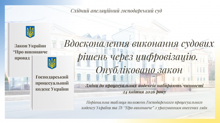 23 квітня 2026 року в газеті «Голос України» опубліковано Закон України «Про внесення змін до деяких законодавчих актів України щодо удосконалення порядку виконання судових рішень, рішень інших органів та цифровізації окремих етапів виконавчого провадження» від 07.04.2025 № 4833-IX, який набирає чинності через шість місяців з дня його опублікування – 23 жовтня 2026 року.