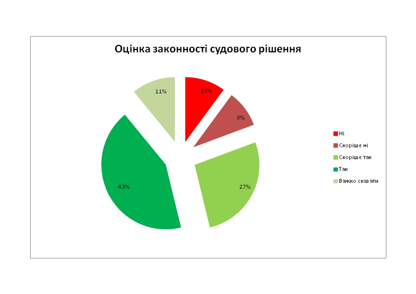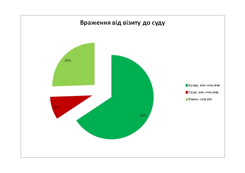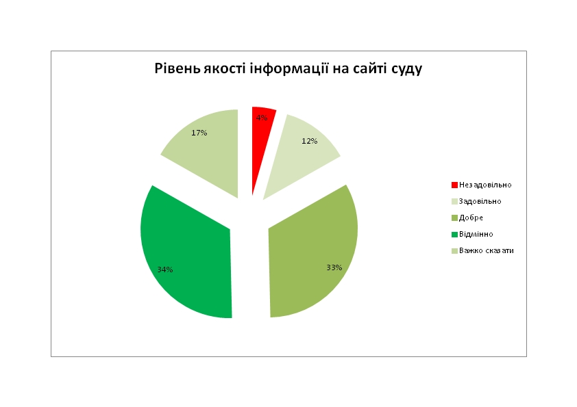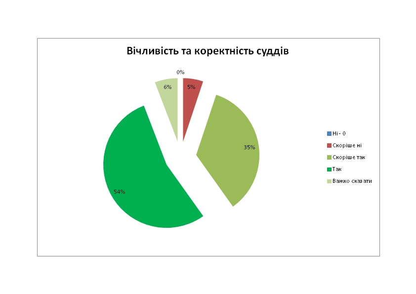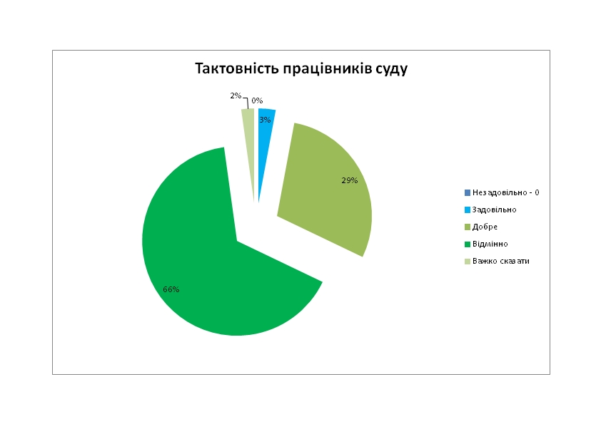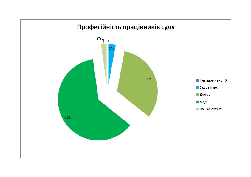 Як уже зазначалося, переважна більшість респондентів високо оцінила якість функціонування суду. Щоб проілюструвати дане твердження подамо декілька діаграм з ключових запитань анкети: