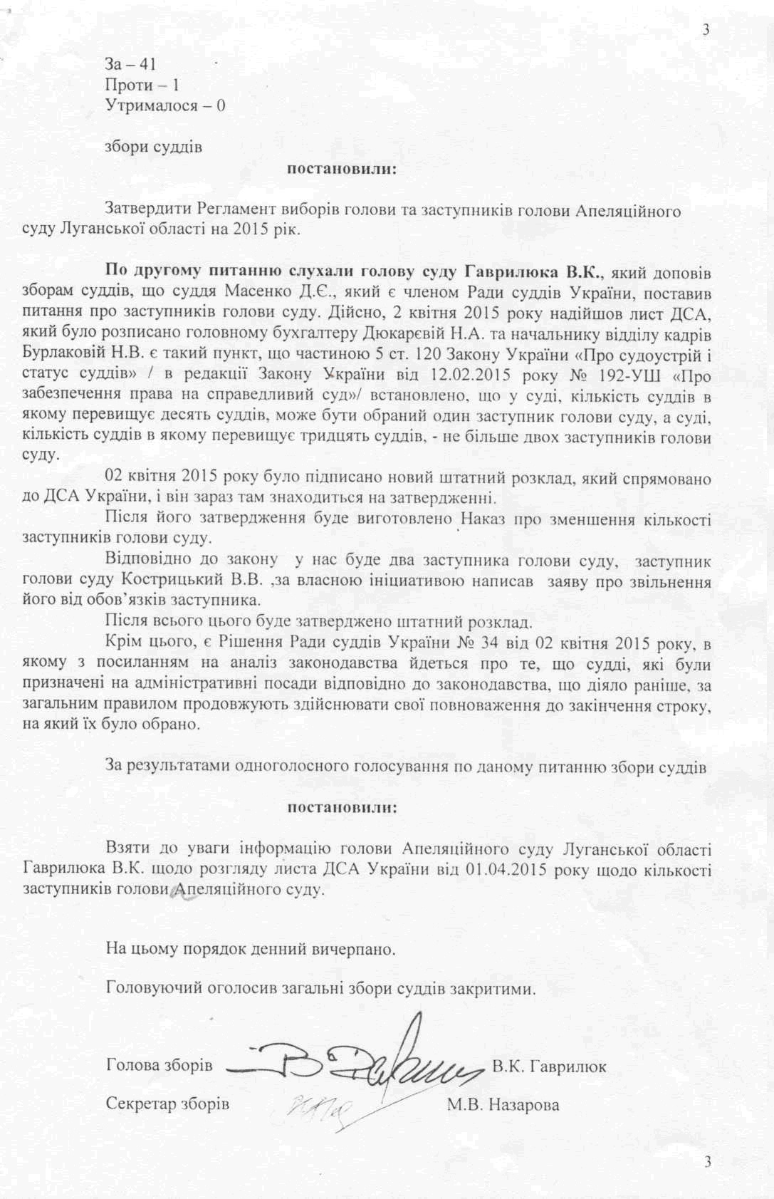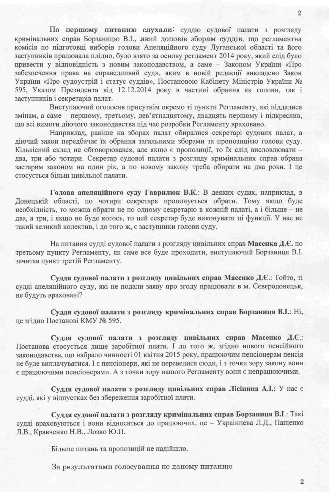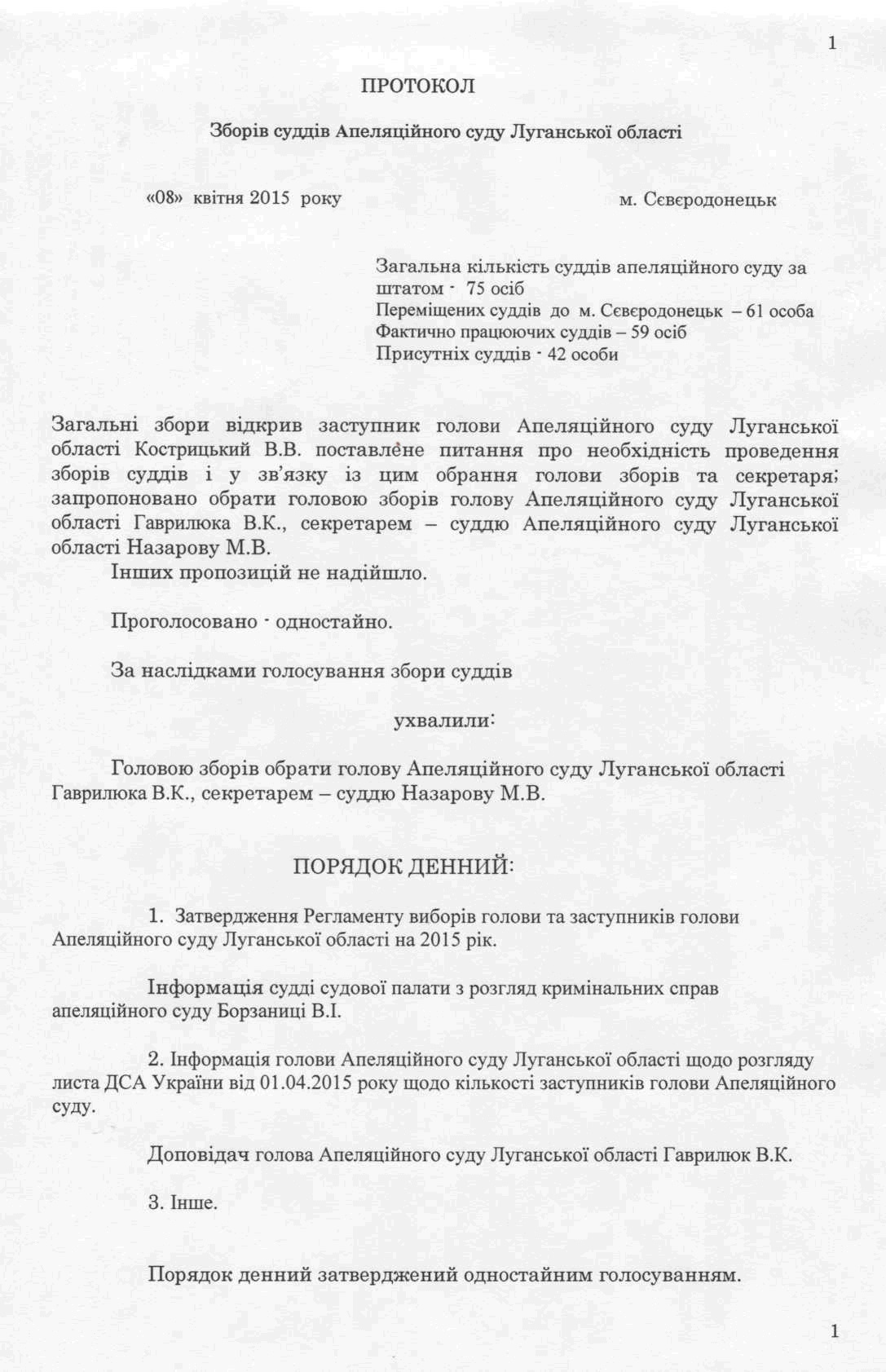Зборами було затверджено регламент виборів голови Апеляційного суду Луганської області, заступників голови та секретарів судових палат Апеляційного суду Луганської області, при цьому було прийнято до уваги інформацію голови суду щодо розгляду листа ДСА України від 01.04.2015 р.