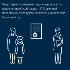 У постанові колегія суддів ККС ВС зазначила таке. За змістом ч. 1 ст. 226, ч. 8 ст. 228, ч. 1 ст. 354 Кримінального процесуального кодексу України під час проведення слідчої дії з неповнолітнім потерпілим та його допиту в суді участь педагога не є обов’язковою, якщо процесуальна дія проводиться за участю законного представника. У цьому випадку процедура впізнання за участю потерпілої та її допит у суді першої інстанції проводилися у присутності її матері. Тому зазначені докази не можуть бути визнані недопустимими.