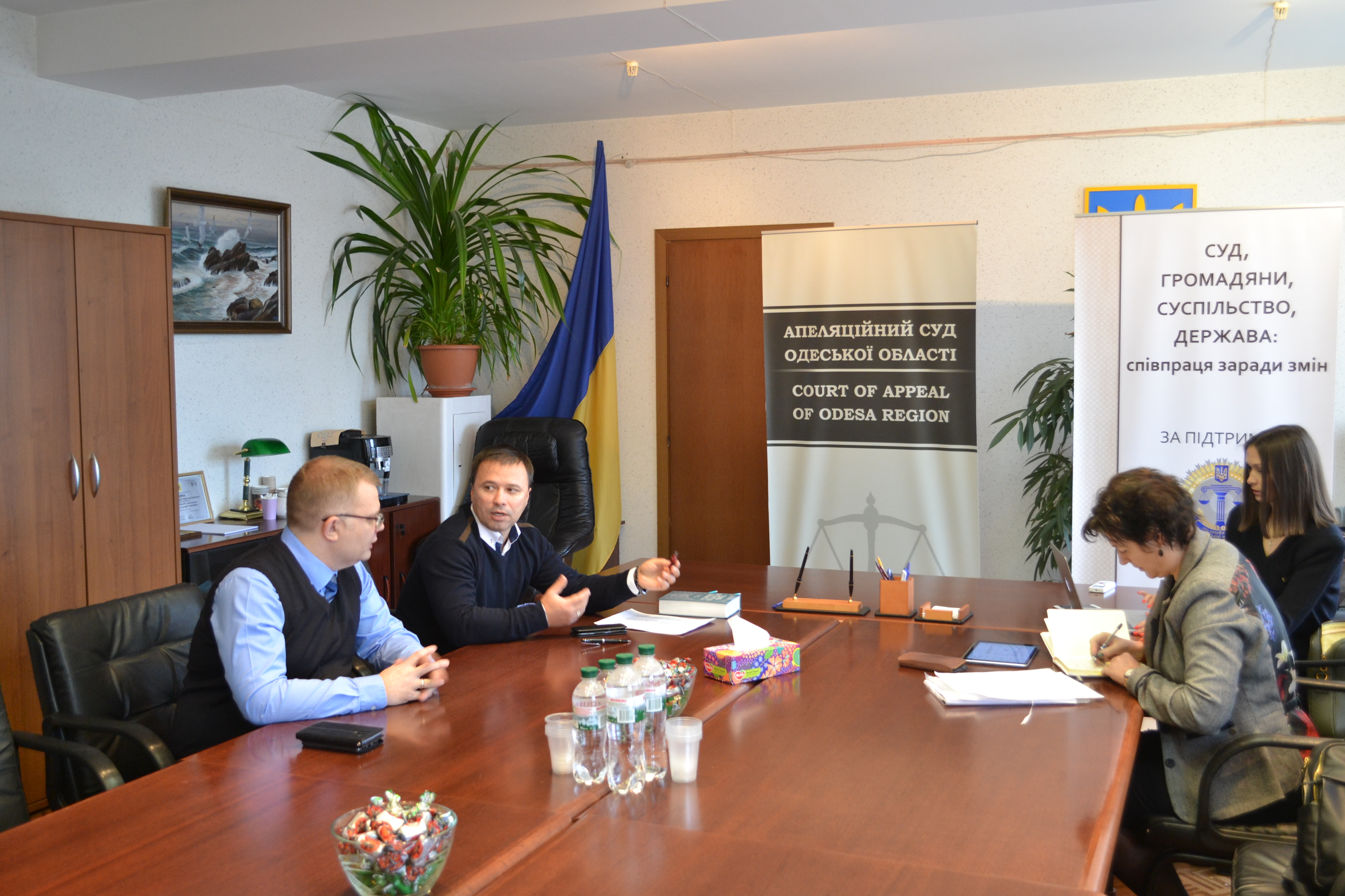 Сьогодні в приміщенні апеляційного суду Одеської області відбулось засідання робочої групи міжнародного проекту «Суд, громадяни, суспільство, держава: співпраця заради змін». На засіданні були присутні координатори проекту: заступник голови апеляційного суду Одеської області Андрій Дрішлюк та суддя Очаківського міськрайонного суду Миколаївської області Тетяна Шевиріна, експерт проекту суддя, заступник голови Амстердамського окружного суду (Королівство Нідерланди) Естер де Рой та суддя апеляційного суду Одеської області Юліан Кравець.