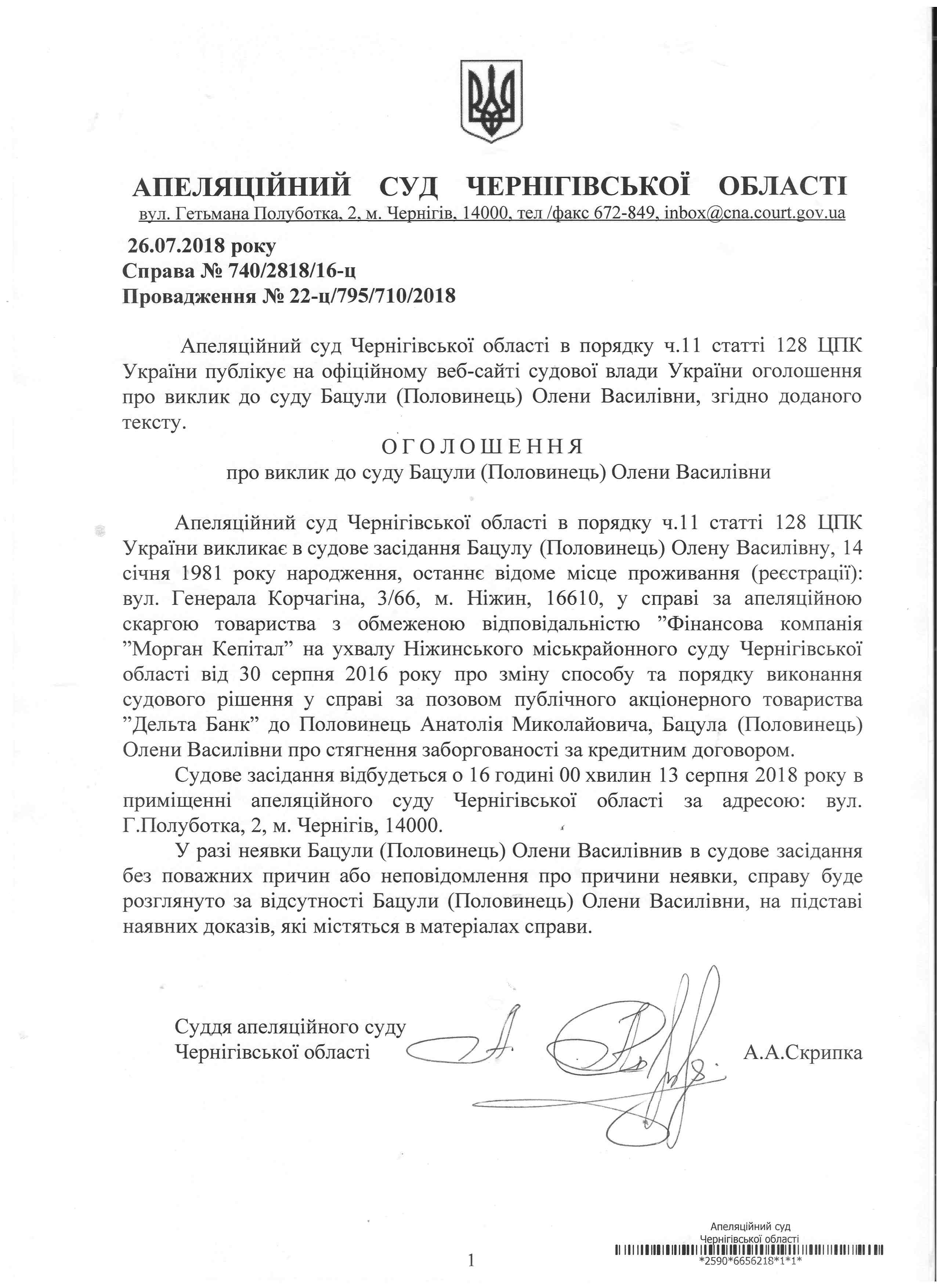 Виклик Бацули (Половинець) Олени Василівни