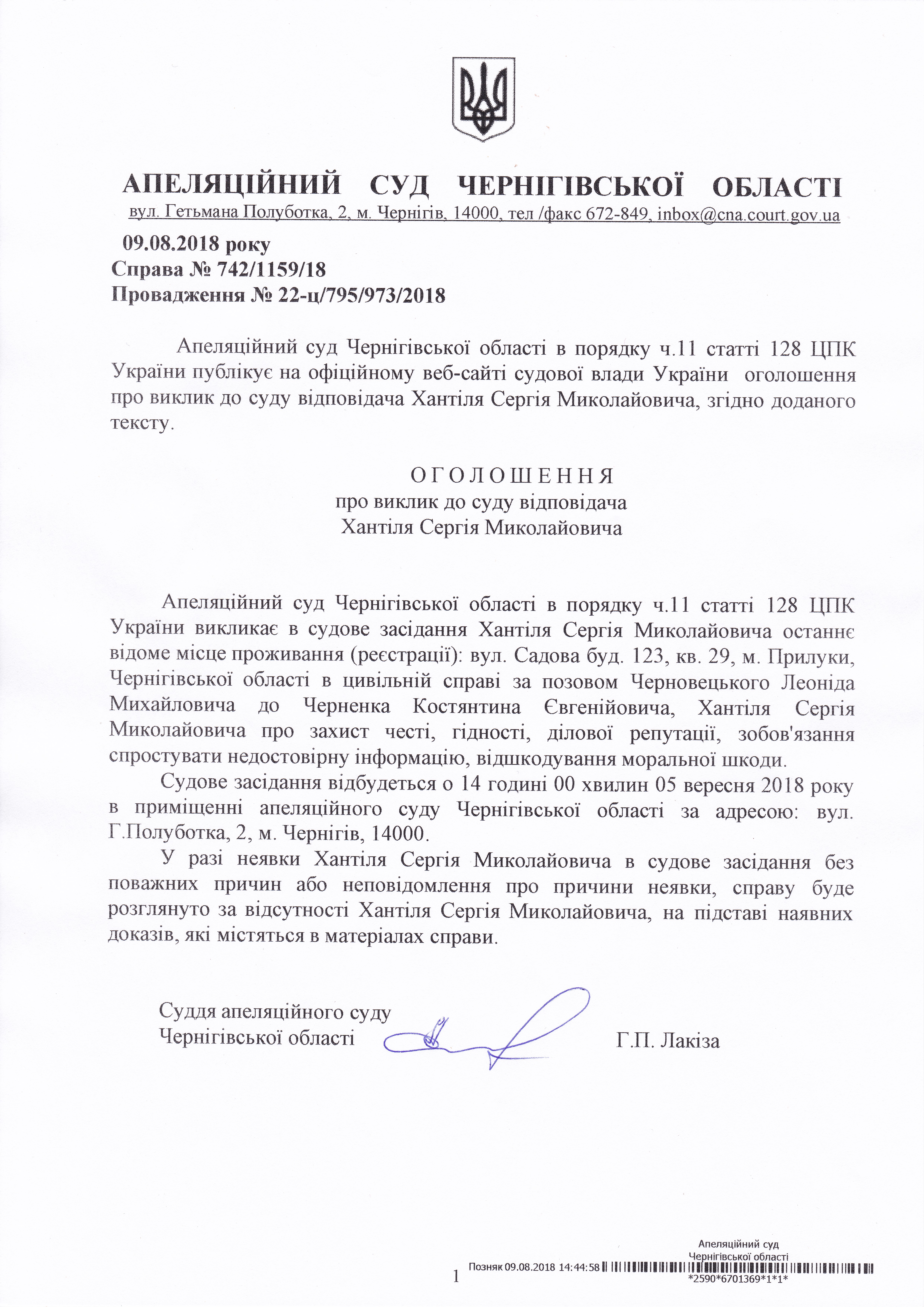 Виклик Хантіля Сергія Миколайовича