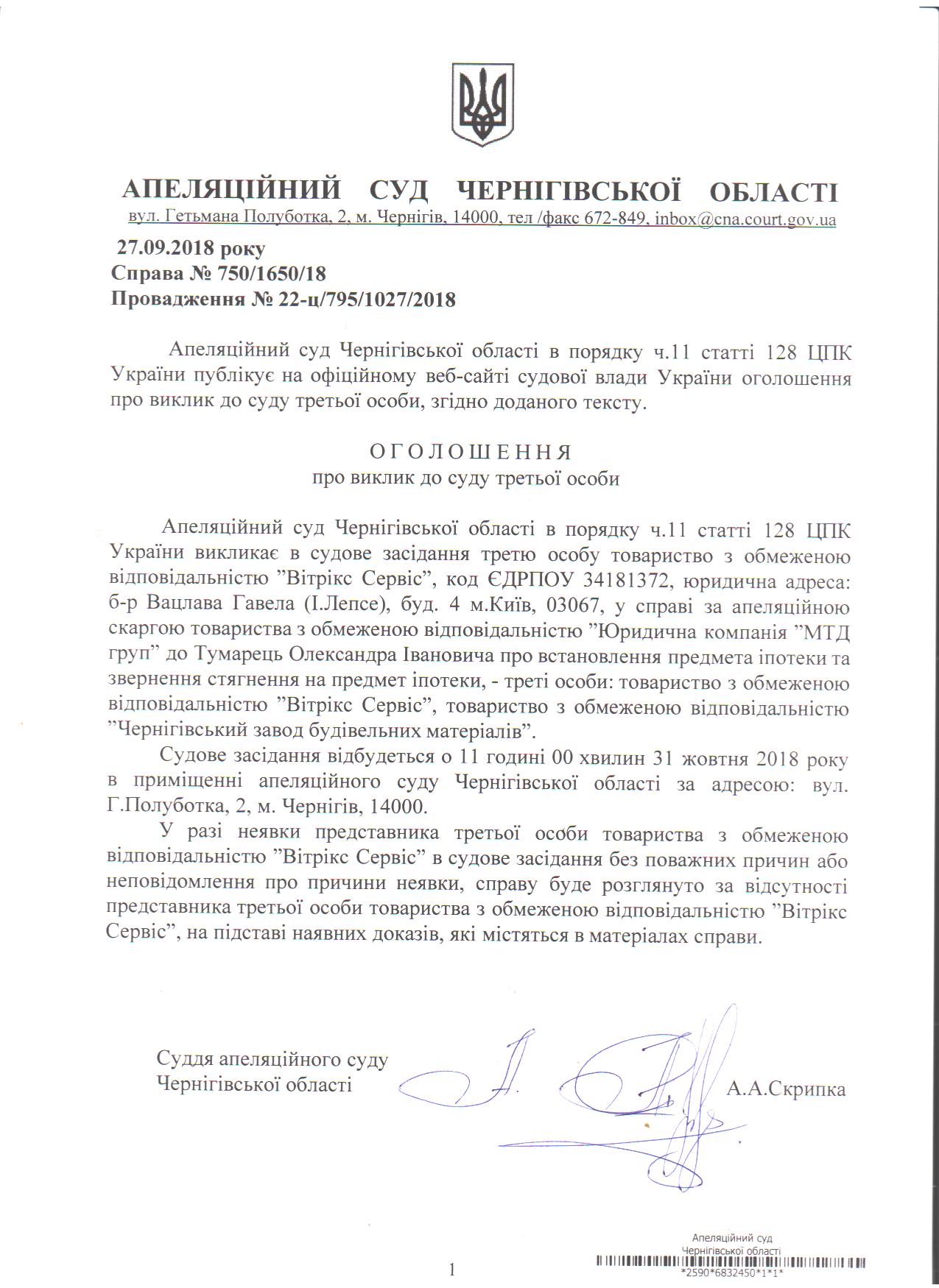 Виклик ТОВ "Вітрікс Сервіс"