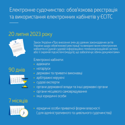 Within 90 days from the date of its publication, in accordance with the requirements of the Commercial Procedural Code of Ukraine, the Code of Administrative Proceedings of Ukraine, and the Code of Civil Procedure of Ukraine, the following persons and entities must have electronic offices in the UJITS or its separate subsystem (modules):