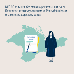 The Criminal Cassation Court of the Supreme Court upheld the guilty verdict against a former Ukrainian judge who continued to administer justice in occupied Crimea. The district court sentenced her to 12 years' imprisonment with confiscation of all her property for high treason (Article 111(2) of the Criminal Code of Ukraine). The court of appeal upheld the verdict.