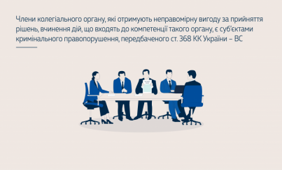 The actions of a person who is a member of a collegial body may also be qualified under Art. 368 of the Criminal Code of Ukraine in cases where the decision on the issue for which the unlawful benefit was transferred is made by this collegial body by a joint decision based on the results of voting. Moreover, it does not matter what decision was made by such a collective body (one that was of interest to the provider of the unlawful benefit, or vice versa, i.e. positive or negative). After all, Article 368 of the Criminal Code of Ukraine establishes criminal liability for specific acts, including obtaining an unlawful benefit, without specifying the success of achieving the desired result by the provider of the unlawful benefit. Thus, members of a collegial body who receive an unlawful benefit for making decisions or performing actions within the competence of such a body are subjects of the relevant corruption offences.