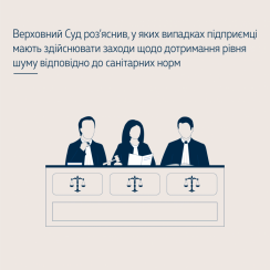 The Supreme Court also formed the legal position, pursuant to which in case of performing by enterprises, institutions, organizations and citizens the activity or application of sound reproducing equipment resulting in the excess of noise level established with sanitary norms, in such premises and on such territories they shall take measures to prevent the formation and to decrease noise till the level established with sanitary norms (they are also obliged to develop project documentation and to take measures on decreasing the impact of noise load on environment).