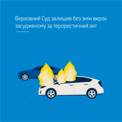 Advocate and an individual convicted to 15 years of imprisonment with the confiscation of whole property owned by him, to be served in a closed penal institution, filed their cassation complaints to the Supreme Court. Courts of first and appeal instances found that the convicted person involving other individuals, in collusion with them, had detonated a car (Part 2 of Article 27 and Part 3 of Article 258 of the Criminal Code of Ukraine). Due to this, six persons have been wounded, one person has died.